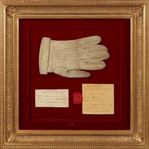 2. «Docteur Cogny, médecin du prince de Talleyrand, l'a donné au docteur Paul Renaud, docteur ... de Castelane.»The glove is framed with the two inscriptions. Modern frame.