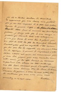 «J'ai été si touchée, Madame la Maréchale, en apprenant que vous désiriez mon portrait que je me suis empressée de le faire moi-même, heureuse de pouvoir l'offrir, à la femme d'un brave de notre tems dont le souvenir me sera toujours précieux. Je charge votre fils de vous envoyer ce portrait, qui demande toute votre indulgence. Je n'ai pas besoin de vous dire le plaisir que m'a fait la visite du fils du maréchal Clausel, d'autant plus qu'il est impossible d'être mieux que lui sous tous les rapports. Son charmant talent sur la musique a procuré de l'agrément à notre solitaire retraite [...].