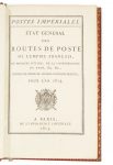 ■POSTES IMPÉRIALES. ÉTAT GÉNÉRAL DES ROUTES DE POSTES DE L'EMPIRE FRANÇAIS P. Imprimerie Impériale 1814. In-8 ; maroquin rouge roulette à décor de feuilles en encadrement sur les plats, armoiries centrales de l'Empereur Napoléon.