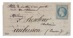 Lettres adressées pendant le Siège de Paris de 1870-71 par Alfred ROSELEUR à sa femme Léonie, restée dans leur château près d'Aubusson, à l'aide de ballonnets lancés de son balcon rue des Gravilliers, après avoir indiqué préalablement sur les enveloppes :
