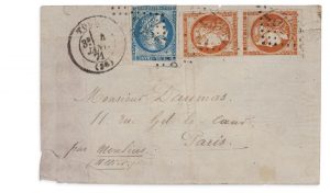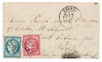 ─ L.M. datée de Florensac (Hérault) 3 janv. 71, adressée à un militaire, affr. paire n°43, 10c. bistre Bordeaux, obl. c.à.d.