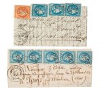 ─ L.M. datée de Loriol 5 janv. 71, affr. 3 ex. n° 45, 20c. bleu Bordeaux t. II et n°48, 40c. orange, obl. los. G.C.2085, frappée c.à.d. Loriol 3e/6 janv. 71. -