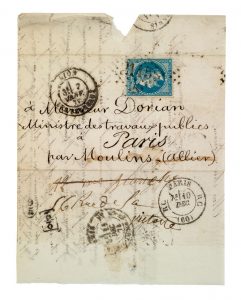 REPÊCHAGE DE 1875 - (PARIS RC).L.M.. datée de Lyon 7 janvier 1870 (erreur de millésime), avec indication "Paris par Moulins" adressée à Monsieur Dorian, Ministre des travaux publics, affr. n° 29, 20c. bleu. Empire lauré (80c. perdu par...