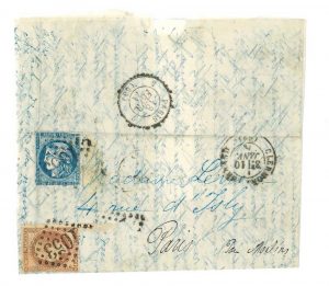 ─ L.M.. datée de Saint-Malo 4 janv. 71 adressée sous enveloppe à Clermont-Ferrand, postée affr. n°31, 40c. orange Empire lauré et n°45, 20c.bleu Bordeaux t. II (un timbre manquant), obl. los. GC 1053, avec c.à.d. Clermont-Ferrand (62) 3e/10 janv. 71.