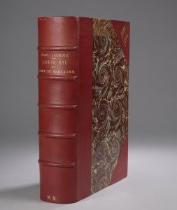 LACROIX (Paul). Louis XII et Anne de Bretagne. Paris, Georges Hurtrel, Artiste-Éditeur, 1882. Fort volume in-4°, demi-maroquin rouge à coins, large monogramme « M. M. » doré en tête du premier plat, dos à nerfs, tête dorée, non rogné,...