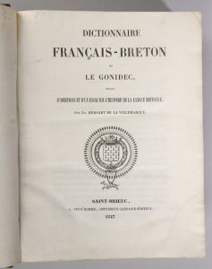 LE GONIDEC (Jean François). • Dictionnaire français-breton, •• Dictionnaire breton-français. Saint-Brieuc, L. Prud’homme, Imprimeur-Libraire-Éditeur, 1847-1850. 2 volumes in-4°, demi-chagrin vert sombre, dos à nerfs orné (reliure...