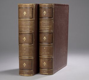 LEVOT (Prosper). Biographie bretonne, recueil de notices sur tous les Bretons qui se sont fait un nom […]. Vannes, Cauderan, Libraire-Éditeur, 1852-1857. 2 volumes in-4°, demi-chagrin brun, dos à nerfs orné (reliure de l’époque).