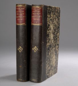 MANET (François-G.-P.-B.). Histoire de la Petite-Bretagne, ou Bretagne-Armorique, depuis ses premiers habitans connus. Saint-Malo, Chez l’Auteur & F. Caruel, 1834. 2 volumes in-8°, demi-maroquin brun à grain long, dos lisse orné (reliure de...