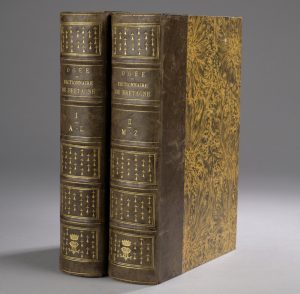OGÉE (Jean-Baptiste). Dictionnaire historique et géographique de la province de Bretagne […]. Rennes, Molliex, Libraire-Éditeur, 1843-1853. 2 volumes in-4°, demi-basane brune, dos à nerfs orné d’hermines dorées, monogramme « P L »...