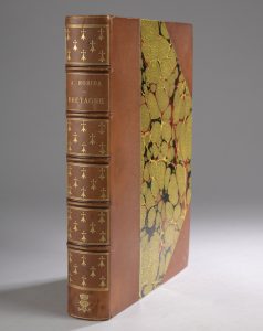 ROBIDA (Albert). La Vieille France. Paris, À la Librairie Illustrée, s. d. In-4°, demi-chagrin orangé à coins, filet doré bordant les plats, dos à nerfs orné d’hermines dorées, monogramme « P L » couronné en pied, tête dorée,...