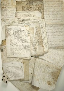 Liasses parchemins et papiers de 1605 (28 x 29), 1557 (42 x 20) 1552 (58 x 49. 1541 (30 x 32).1459 (24 x 12).