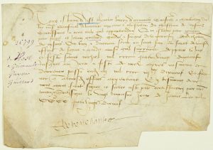 (GARD. 1499.) « CERTIFICATION POUR LES GARDES DU CHÂTEAU DE NIMES. » Parchemin (17 x 24) donné par « Nous Etienne de VESC Chevalier Baron de GRIMAULT Conseiller et Chambellan du Roi, notre sire, Sénéchal de BEAUCAIRE, Capitaine et Châtelain...