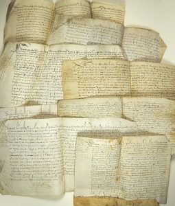 VICOMTÉ DE CAEN (14). 8 grands parchemins de 1545 à 1591. Formats divers.