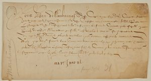 1594. Pièce Signée Jehan de MARCHANVAL Capitaine et ayant charge d’une compagnie de Gens de Guerre à Pied Français au Régiment du sieur de VERDUN confesse avoir et reçu comptant de Messire LECHARRON Conseiller du Roy et Trésorier général...