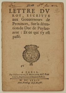 1634. Duc de PUYLAURENS. «LETTRE DU ROY (LOUIS XIII), écrite aux Gouverneurs de provinces, sur la détention du Duc de PUYLAURENT : et ce qui s’y est passé. » - Vignette Royale – Impr. à PARIS, chez A. Estienne, P. Mettayer & C. Prevost,...