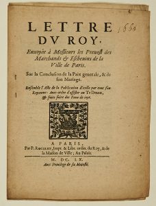 (MARIAGE DE LOUIS XIV avec l’Infante d’Espagne Marie Thérèse d’Autriche 1660. PAIX GÉNÉRALE) - “LETTRE DU ROY, envoyée à Messieurs les Prévôts des Marchands & Échevins de la Ville de PARIS sur la Conclusion de la Paix générale, &...