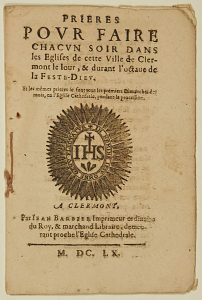 « Prières pour faire chacun soir dans les Églises de cette Ville de CLERMONT, le jour & durant l’octave de LA FESTE-DIEU (la Fête-Dieu) – Impr. à Clermont, par Jean Barbier Imprimeur ordinaire du Roy, & Marchand libraire, demeurant proche l’Église Cathédrale. 1660 – Vignette « IHS. »