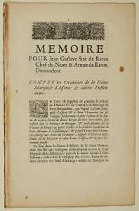 BRETAGNE – Ensemble de deux MÉMOIRES imprimés en 1674 et 1676 pour Jean Gustave Sire de RIEUX Chef du Nom & Armes de RIEUX, Demandeur. Contre les Créanciers de la Dame Marquise D’ASSERAC & autres Défendeurs, au sujet de la tutelle...