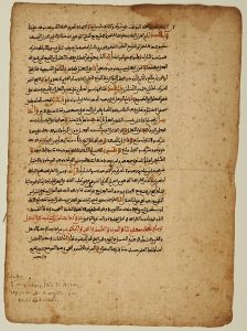 CORAN. MANUSCRIT. Feuille de Coran du XVIIe S. avec cette note manuscrite « Feuillet d’un Exemplaire du Koran rapporté de Kabilie par Amedé Toutain (Membre de l’École française de Rome.) » sous le Second Empire.