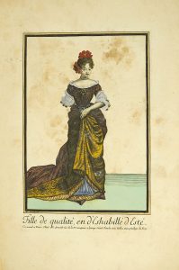 GRAVURE « FILLE DE QUALITÉ EN DÉSHABILLÉ D’ÉTÉ. Ce vend à PARIS, chez N. Arnould rue de la fromagerie, à l’Image Saint Claude aux Halles, avec privilège du Roi. »