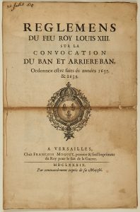 RÉGLEMENTS DU FEU ROY LOUIS XIII sur la Convocation du BAN et Arrière-Ban, ordonnés être faits ès années 1635 & 1639 - Impr à VERSAILLES chez François MUGUET 1er & seul Imprimeur du Roy pour le fait de la Guerre. 1689, 18pp in-folio -