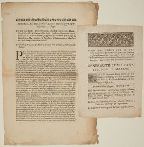 ─ « Sommaire de l’Instance de Requête respectives à juger. Pour Jean TOUSSE, Daniel POLUCHE, Claude BOULARD, Eloy HAUDRY, Denis LE MAISTRE & Mathurin HARDOUIN, cy-devant Courtiers commissionnaires des Vins d’ORLÉANS, opposants à l’exécution d’un Arrêt du Conseil du 3 Mars dernier,… Contre les Maire & Échevins de ladite Ville d’ORLÉANS, Défenseurs et intimés. » (1693). « Par Édit du mois de Juin 1691, le Roy a créé des Offices de Courtiers Commissionnaires de Vins et autres Liqueurs dans tout le royaume… » - 4pp gd in-folio -