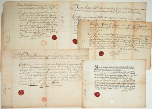 5 Certificats militaires signées Robert PERELLE, Conseiller du Roy, Commissaire Ordinaire des Guerres ayant la conduite et Police du Régiment des Gardes Françaises de sa Majesté (Louis XIV). Certificats de services de 5 Soldats du Régiment des Gardes Françaises de Paris en 1686, 1690, 1690 et 1699, & une pièce concernant sa veuve de 1723.