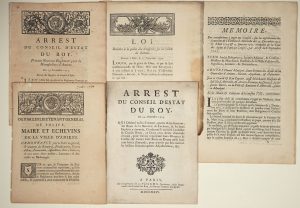 ─ MANUFACTURE D’AMIENS - “Arrest du Conseil d’État du Roy, portant Nouveau Règlement pour la Manufacture d’AMIENS.” – Du 19 novembre 1722 – Imp. de 7pp in 4 avec bandeau ; Fait à PARIS, de l’Impr. Royale – «…Sa Majesté étant informée que depuis la suppression desdits Egards-Ferreurs en Blanc, il s’est introduit dans la Manufacture d’Amiens une infinité d’abus, tant parce que les HOUPIERS, FABRIQUANTS, TEINTURIERS & autres Ouvriers employés dans la dite Manufacture n’ont plus été surveillé…A quoy Sa Majesté voulant pourvoir par un nouveau Règlement, en rétablissant les Fonctions desdits Egards-Ferreurs en Blanc… » -