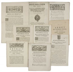 ─ « Règlement contenant les Privilèges & les obligations des propriétaires des Juments dans la Province de Bourgogne. » Dijon 20 Janvier 1768 ; 3pp in-folio