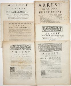 ─ «Arrest de la Cour de Parlement, qui ordonne qu’un Libelle intitulé : Mémoire touchant l’origine & l’autorité du Parlement de France, appelé JUDICIUM FRANCORUM ; sera lacéré & brulé par l’exécuteur de la Haute-Justice, comme attentatoire à la souveraineté du Roy, & contraire aux Lois fondamentales du Royaume. » du 13 août 1732. Impr. à Paris, chez Simon, 4pp in-4°