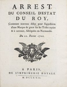 TOILES DE NORMANDIE – « Arrest du conseil d’Estat du Roy, contenant nouveau délai pour l’apposition d’une Marque de grâce sur les Toiles rayées & à carreaux, fabriqués en Normandie. » Du 22 Février 1722 - Vignette - Impr. à Paris...