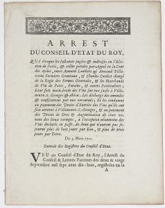 « Arrest du conseil d’Etat du Roy, du 3 mars 1722, qui évoque les instances jugées & indécises en l’Election de Paris, & celles portées par appel en la Cour des Aydes, entre Aymard LAMBERT & Arnaud PILLAVOINE Fermiers Généraux, & Charles CORDIER chargé de la Régie des Fermes générales, & les Marchands de Vin de Paris, Forains, & autres Particuliers ; Leur fait mainlevée des vins sur eux saisis à VILLENEUVE-SAINT-GEORGES & ABLON ; les décharge des amendes & confiscations par eux encourues, et les condamne au payement des Droits d’Entrées des Vins qu’ils ont fait arriver à Villeneuve-Saint-Georges, & au payement des Droits de Gros … » -