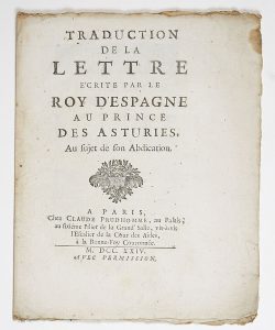 (ABDICATION DE PHILIPPE ROI D’ESPAGNE.) “Traduction de la Lettre écrite par le Roy d’ESPAGNE au Prince des ASTURIES, au sujet de son Abdication.” - Imp. 6pp in-4°, à Paris, chez Claude Prudhomme, au Palais, au sixième pilier de la...