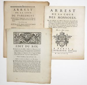 ─ (AFFINEURS D’OR DE PARIS) “Édit du ROI, qui supprime les deux Offices d’Affineurs & Départeurs d’Or & d’Argent de PARIS; & révoque la réunion faite à la Communauté des Tireurs d’Or de LYON, des fonctions et des droits des quatre Offices d’Affineurs & Départeurs d’Or & d’Argent qui avaient été créés pour cette ville, & qui ont été depuis supprimés.” -