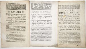 ─ « INSTRUCTION sur soit-montré pour le sieur Jean Joseph HENRY, Maître PERRUQUIER, Lieutenant du premier Chirurgien du roi. Contre le sieur Thomas BOUCHAU, Maître Perruquier ; & les Prévôts , syndics & Gardes du Corps des Maîtres Perruquiers. » -