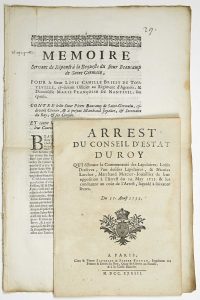 ─ “Arrest du Conseil d’Estat du Roy, qui déboute la Communauté des LAPIDAIRES; Louis Desféves, l’un desdits Lapidaires, & Nicolas Larcher, Marchand MERCIER-JOÜAILLIER de leur opposition de l’Arrest du 19 May 1733 & les condamne au coût de l’arrest, liquidé à soixante livres -