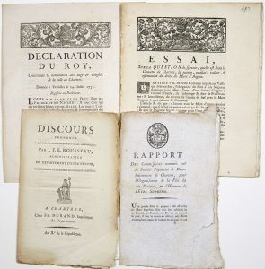 ─ « DISCOURS prononcé le 30 floréal, l’An second de la République Française, une et indivisible, par J.F.E. ROUSSEAU, Administrateur du Département d’Eure-et-Loir, Vice-Président de la Société Populaire de CHARTRES. » (A Chartres, chez Fr. DURAND, Imprimeur du Département, An 2 de la République 7pp. in-8°)