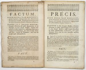 ─ FACTUM et PRÉCIS, « pour Noble Jean MARCASSUS Ancien Capitoul, entrepreneur de la Manufacture royale de LA TERRASSE, Propriétaire et Entrepreneur de celle D’AUTERIVE, intimé, Contre le Sieur Jacques MASSIAC, commis-Directeur de ladite Manufacture de la terrasse ; le sieur Joseph MASSIAC Commis Directeur de celle D’AUTERIVE, appelants… et contre le sieur Emanuel GEZ, intimé & défenseur, tous trois intéressés audit Manufacture. »