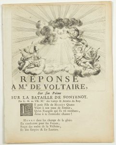 (BATAILLE DE FONTENOY le 11 Mai 1745.) « RÉPONSE à Mr de VOLTAIRE, sur son poème sur la Bataille de FONTENOY. » Par L.M. de TR. Maréchal des Camps & Armées du Roy. Allusion au Maréchal de Saxe qui triomphe à Fontenoy. Impr. de 4 pages...