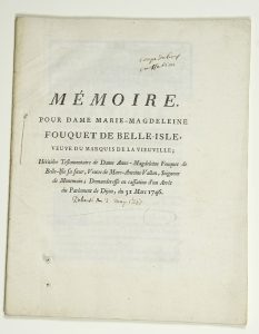 (FOUCQUET DE BELLE-ISLE) - “Mémoire pour Dame Marie-Magdeleine FOUQUET DE BELLE-ISLE, veuve du Marquis de LA VIEUVILLE ; Héritière Testamentaire de Dame Anne-Magdeleine Fouquet de Belle-Isle sa soeur, Veuve de Marc-Antoine VALLON, Seigneur de...