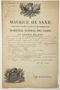Hermann Maurice, Comte de SAXE, Maréchal de France en 1744. Pièce Signée « M. de SAXE » à son entête gravée « Maurice de SAXE, Duc de Courlande et de Semigalie, Maréchal Général des Camps et armées du Roy » (sans date, vers 1747) –