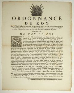 « Ordonnance du Roy, portant défenses à tous les Sujets de Sa Majesté, autres que ceux qui servent actuellement dans ses Troupes, de porter aucun habit uniforme desdites Troupes. & à tous les Marchands fripiers & autres d’en exposer en vente, & d’en garder dans leurs Boutiques ou Magasins. » -
