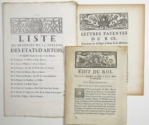 ─ « Lettres Patentes du Roi, concernant les Collèges d’ARRAS et de BÉTHUNE. » - Données à Versailles au mois de Juin 1777 – Impr. à Paris, de l’Imprimerie Royale, 1777, 11 pages in-4° - Tableau – Bandeau décoratif.