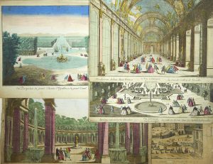 CHÂTEAU DE VERSAILLES. 5 VUES D’OPTIQUE XVIIIe s. (+ 1 collée sur le même carton). Qq. défauts, déchirures & accidents divers.