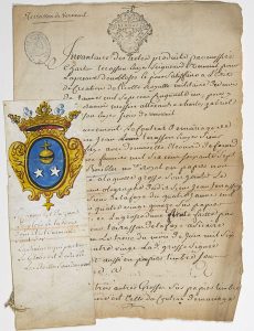 TERRASSON DE VERNEUIL. MANUSCRIT AVEC SCEAU AUX ARMES PEINT. – « Inventaire des actes produits par Messire Charles TERRASSON Ecuyer Seigneur de VERNEUIL pour la preuve de noblesse et pour satisfaire à l’Édit de création de l’École Royale...