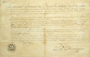Pièce signée (28 x 44) à son entête gravé en tant que « Duc d’AIGUILLON, Pair de France, Comte D’AGENOIS ET CONDOMOIS et de Plelo, Baron d’Arvest, Saujon, et Pordic, Marquis de Moncornet, Prévôt de Larçay, Seigneur de Verest et autres lieux, Maréchal des Camps et armées du Roy, Noble Genois, Gouverneur pour le Roy des Ville, citadelle, par cet Château de la Fère. »
