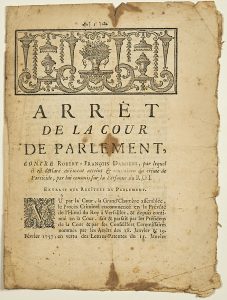 « Arrêt de la Cour de Parlement, du 26 mars 1757, contre Robert-François DAMIENS, par lequel il est déclaré dûment atteint et convaincu du crime de Parricide, par lui commis sur la personne du ROI. »