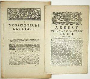 ─ (PRIVILÈGES DE BRETAGNE) – « Arrest du Conseil d’État du Roi du 3 May 1765. » suivi de l’ordonnance de RAUDIN Commissaire des Guerres en Bretagne, fait à RENNES le 8 Mai 1765 –