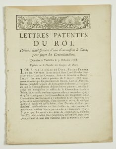 (CALVADOS. 1769. CONTREBANDE) - “Lettres Patentes du ROI, portant établissement d’une Commission à CAEN, pour juger les CONTREBANDIERS.” - Données à VERSAILLES, le 9 Octobre 1768 - Bandeau - à PARIS, de l’Imprimerie Royale, 1769 ; 7pp...
