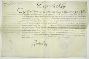 CHÂTEAU DE VERSAILLES (78) 1er Avril 1770 - De par le ROY, CHARGE DE PORTIER DE MADAME LA DAUPHINE, “Notre très amée petite Fille étant à Versailles” pour le Sieur De CAUX DESLONDES - Vélin (47 x 32) en partie imprimé - Sceau sous papier -